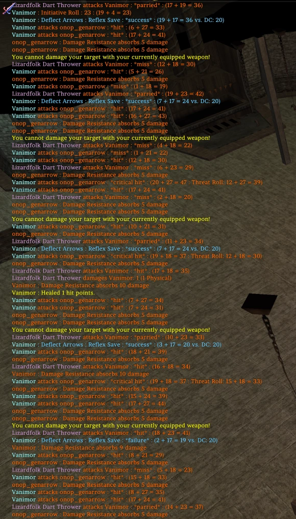 - [CHAT WINDOW TEXT] [Fri Mar 8 15:04:24] Lizardfolk Arbalist attacks Vanimor : *parried* : (20 + 21 = 41)